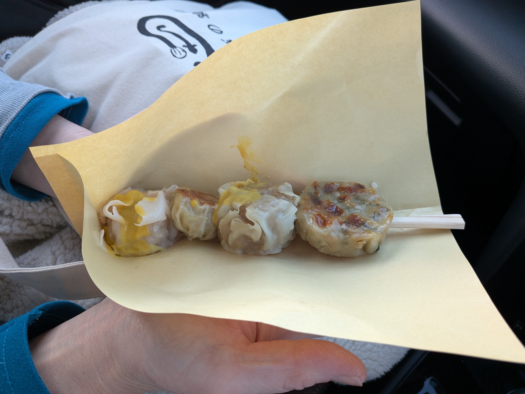 焼売、えび焼売、小籠包、にら饅頭が刺さっています( ゚Д゚)