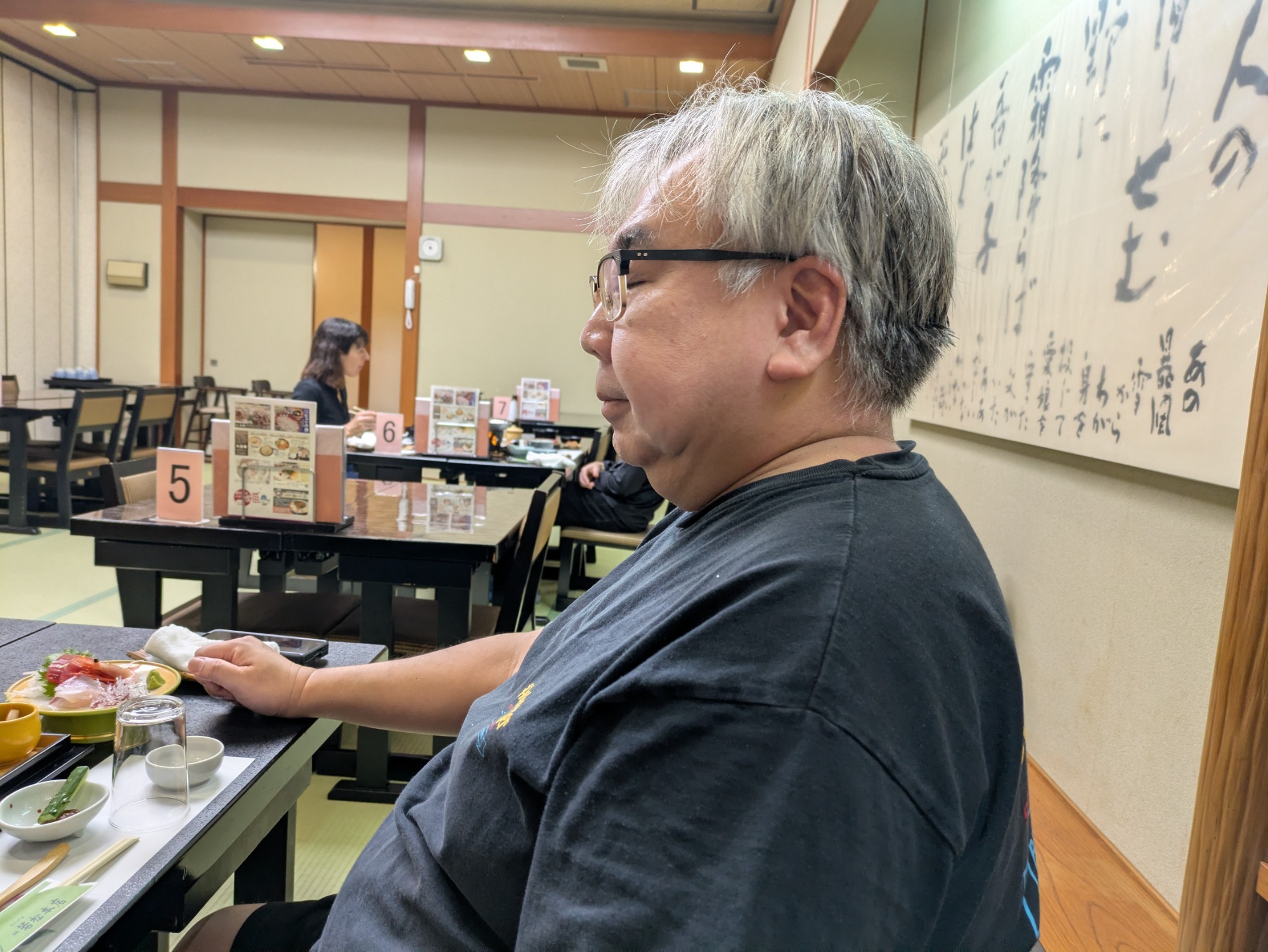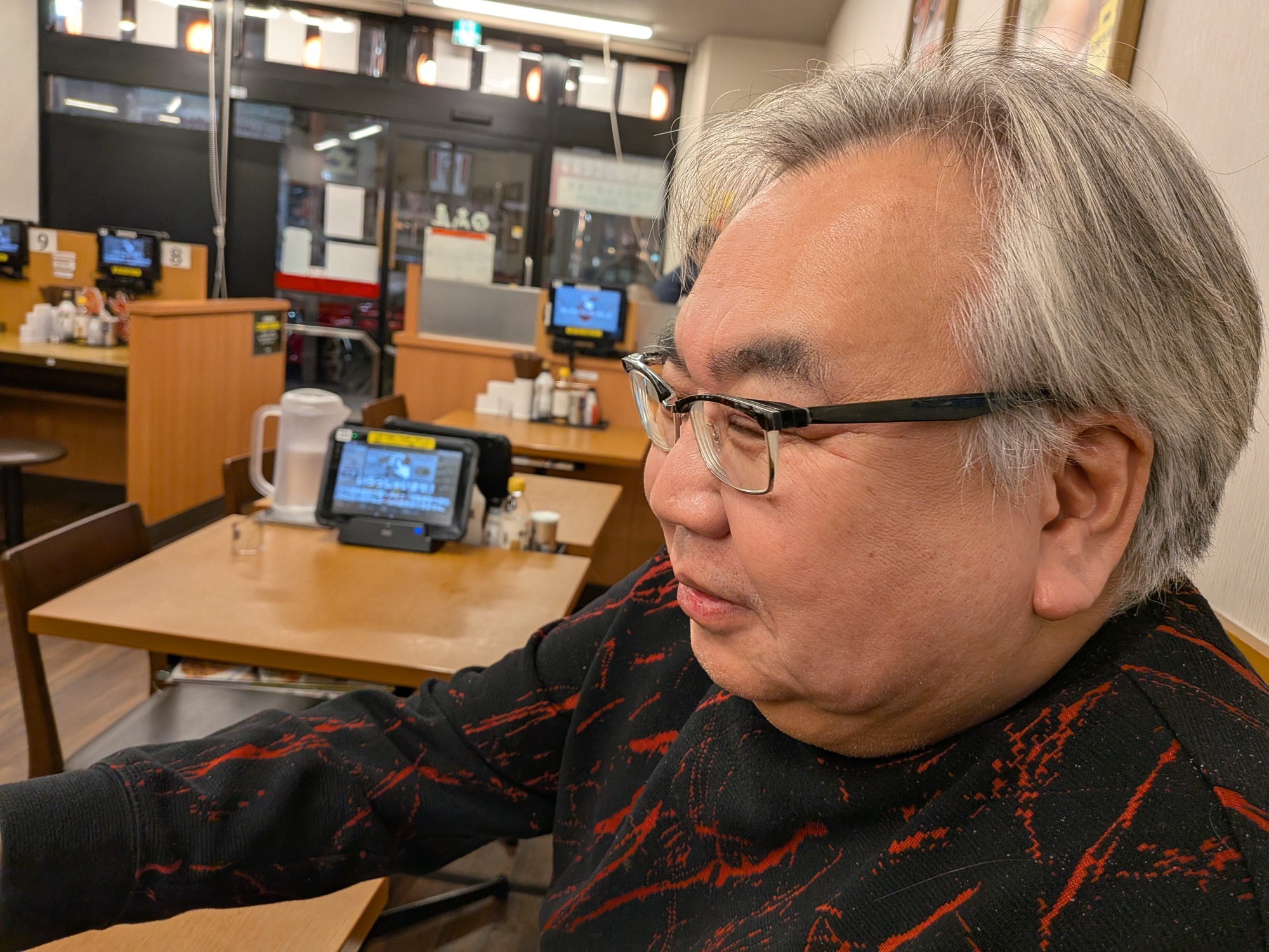メニューを横目で見る潤子さんの図