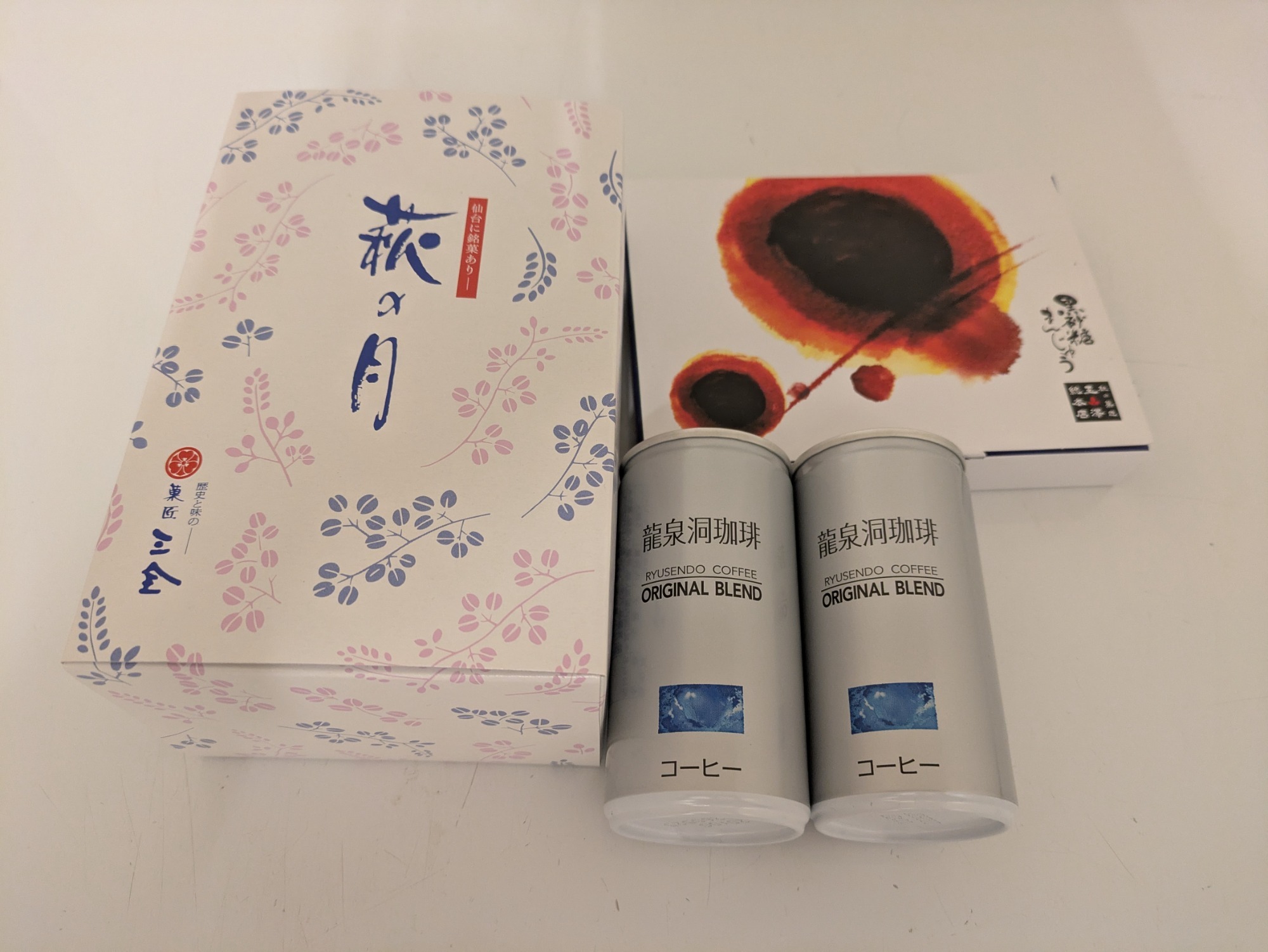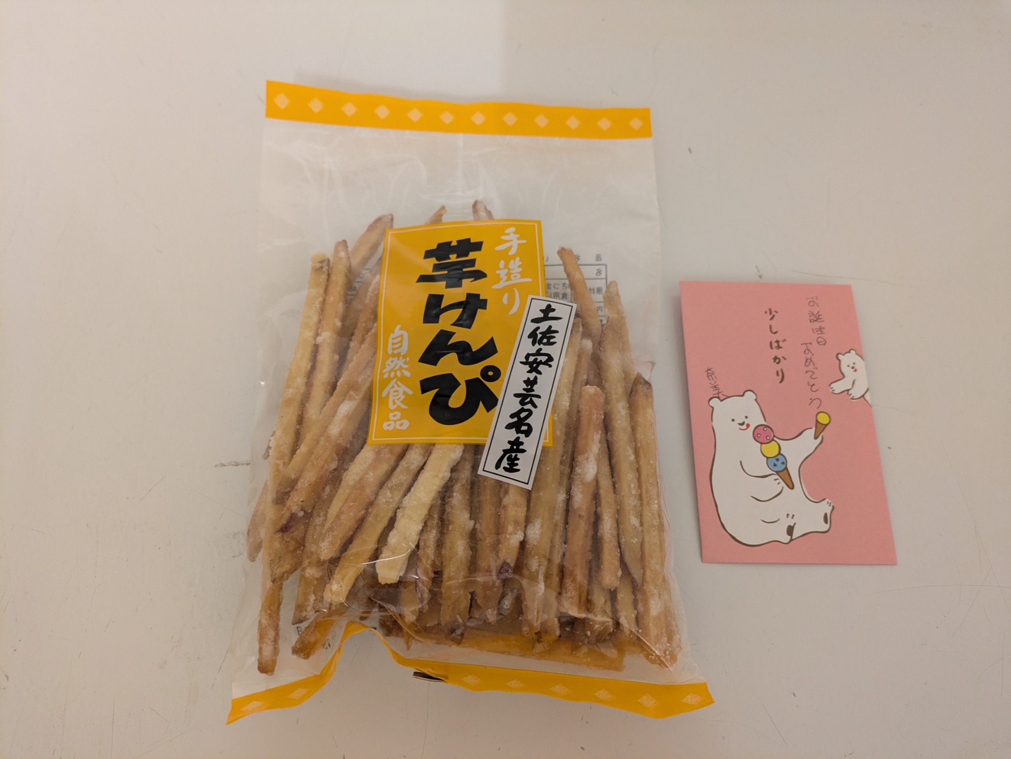 高地に行かれてたNみさんが芋けんぴのおみやげと潤子さんの誕生日お祝いを持ってきてくださいました(*- -)(*_ _)ペコリ
