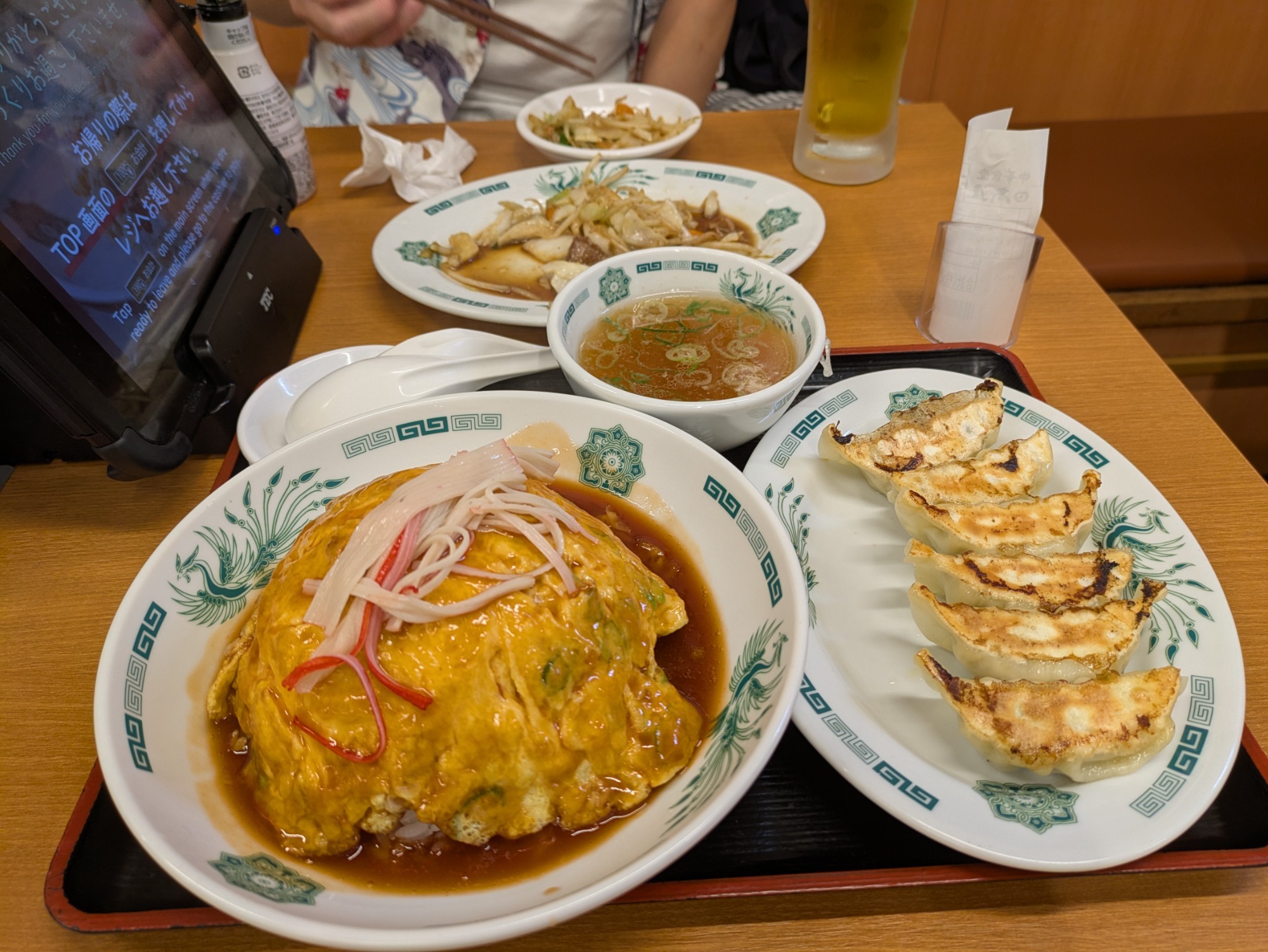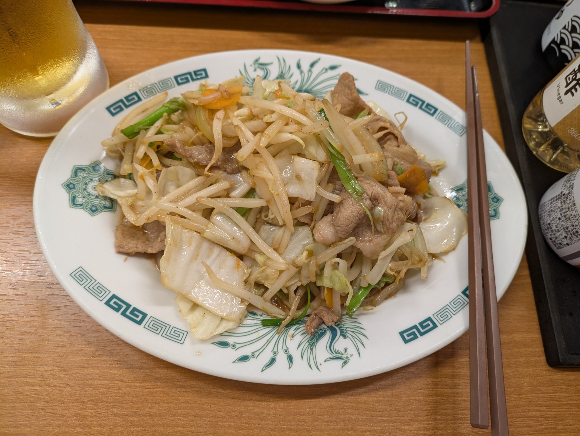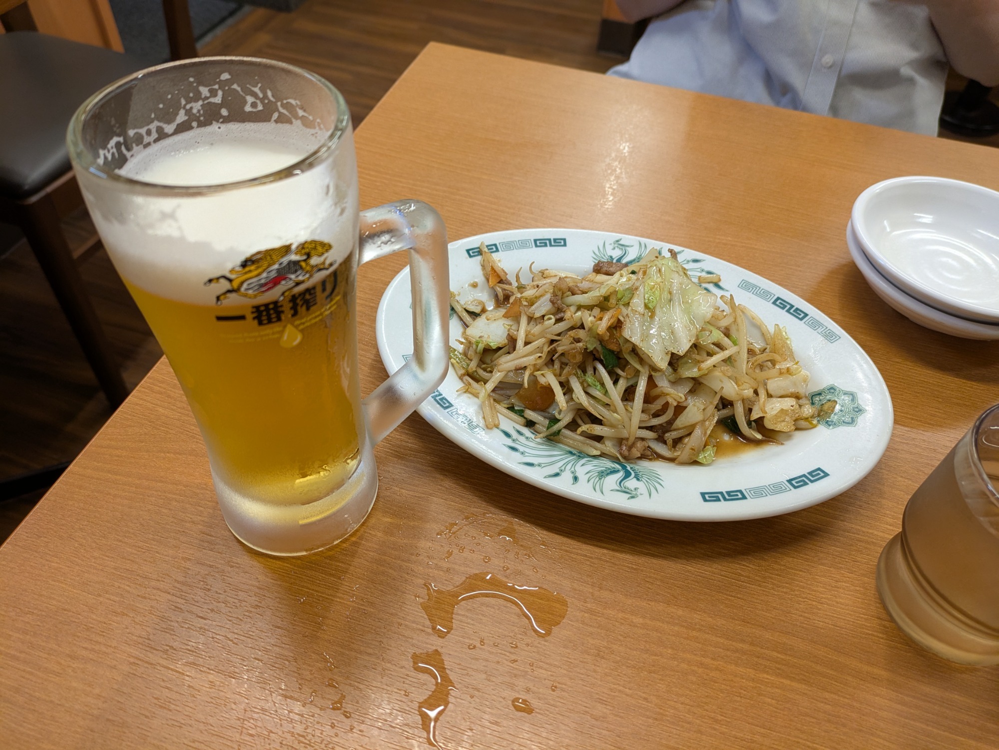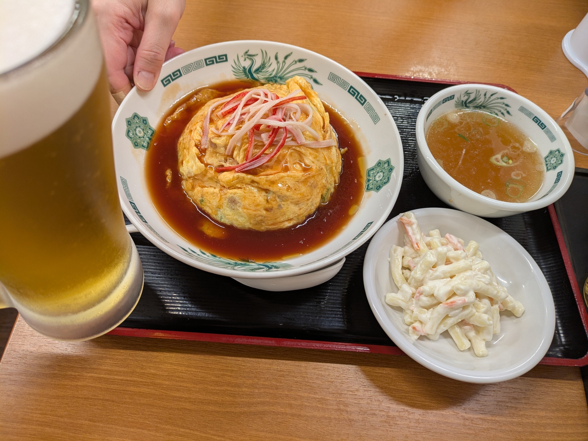 ビール、野菜炒め、天津飯と餃子のセット(;^ω^)