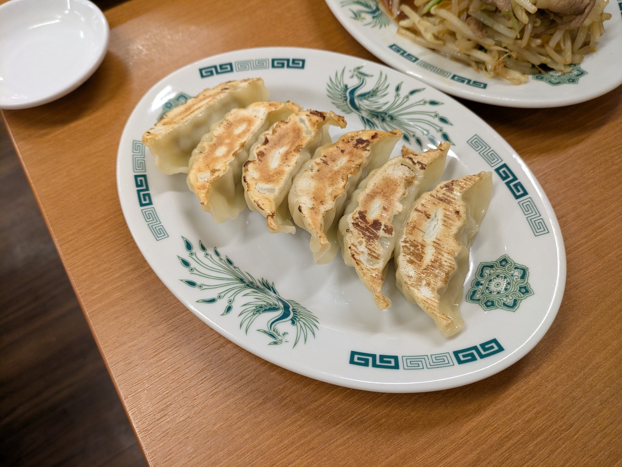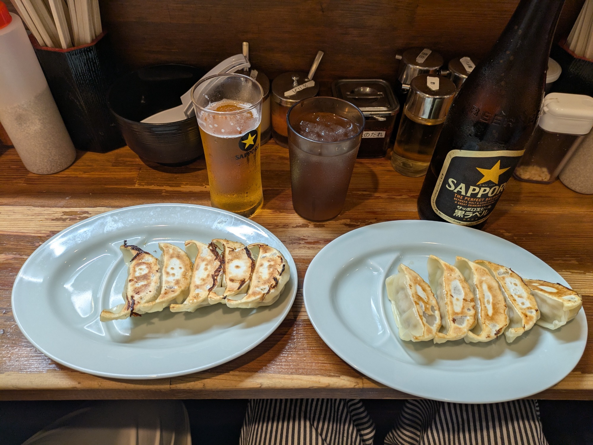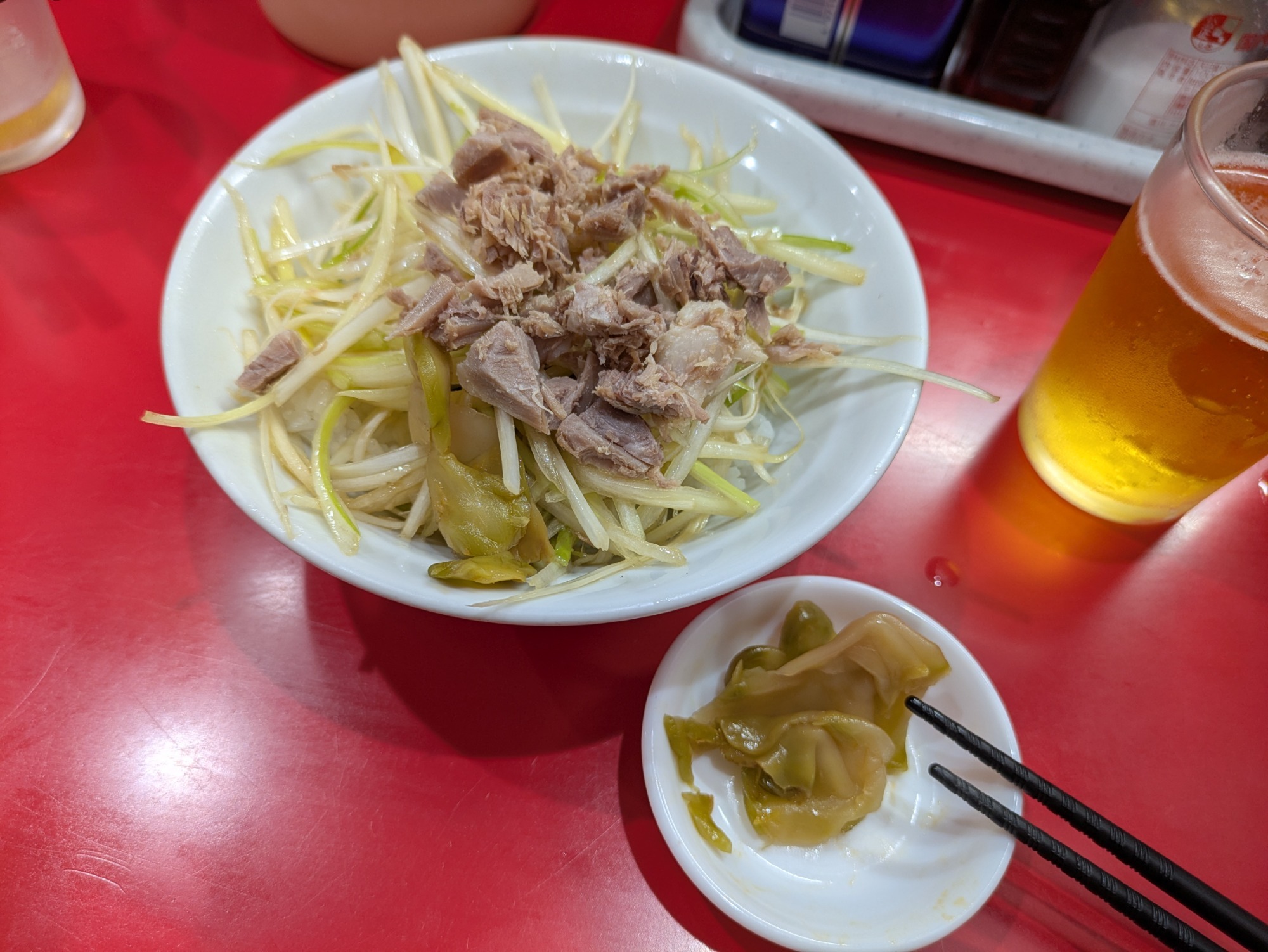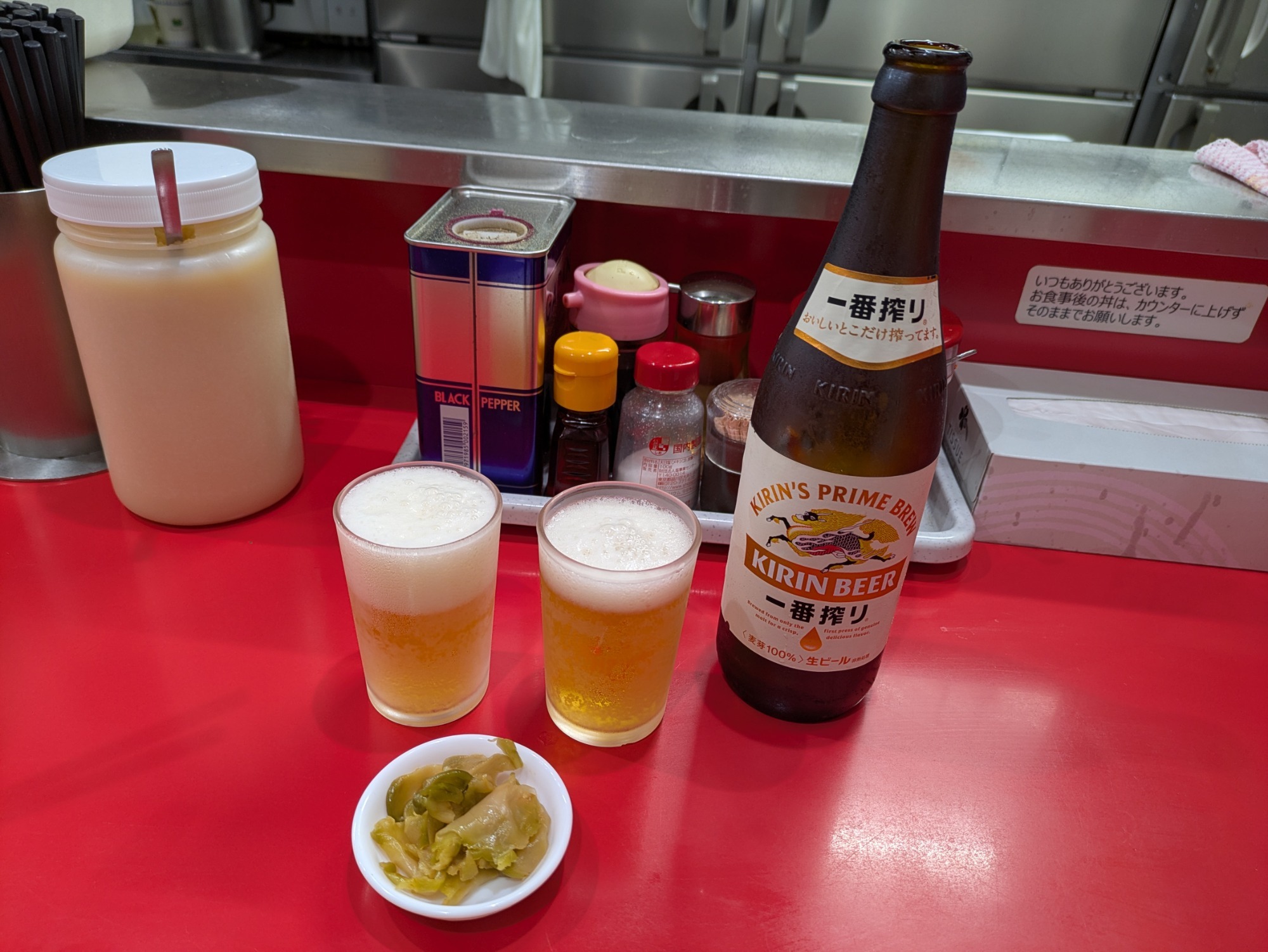 ビール、野菜炒め、天津飯と餃子のセット(;^ω^)