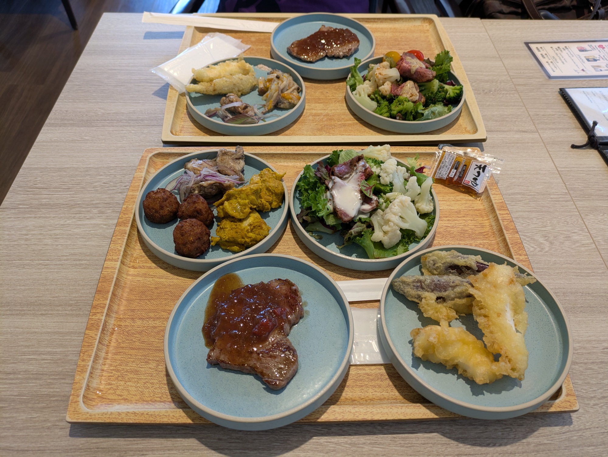 天ぷら取ったりステーキ取ってサラダなんかも盛り盛りです(´∀`*)ウフフ